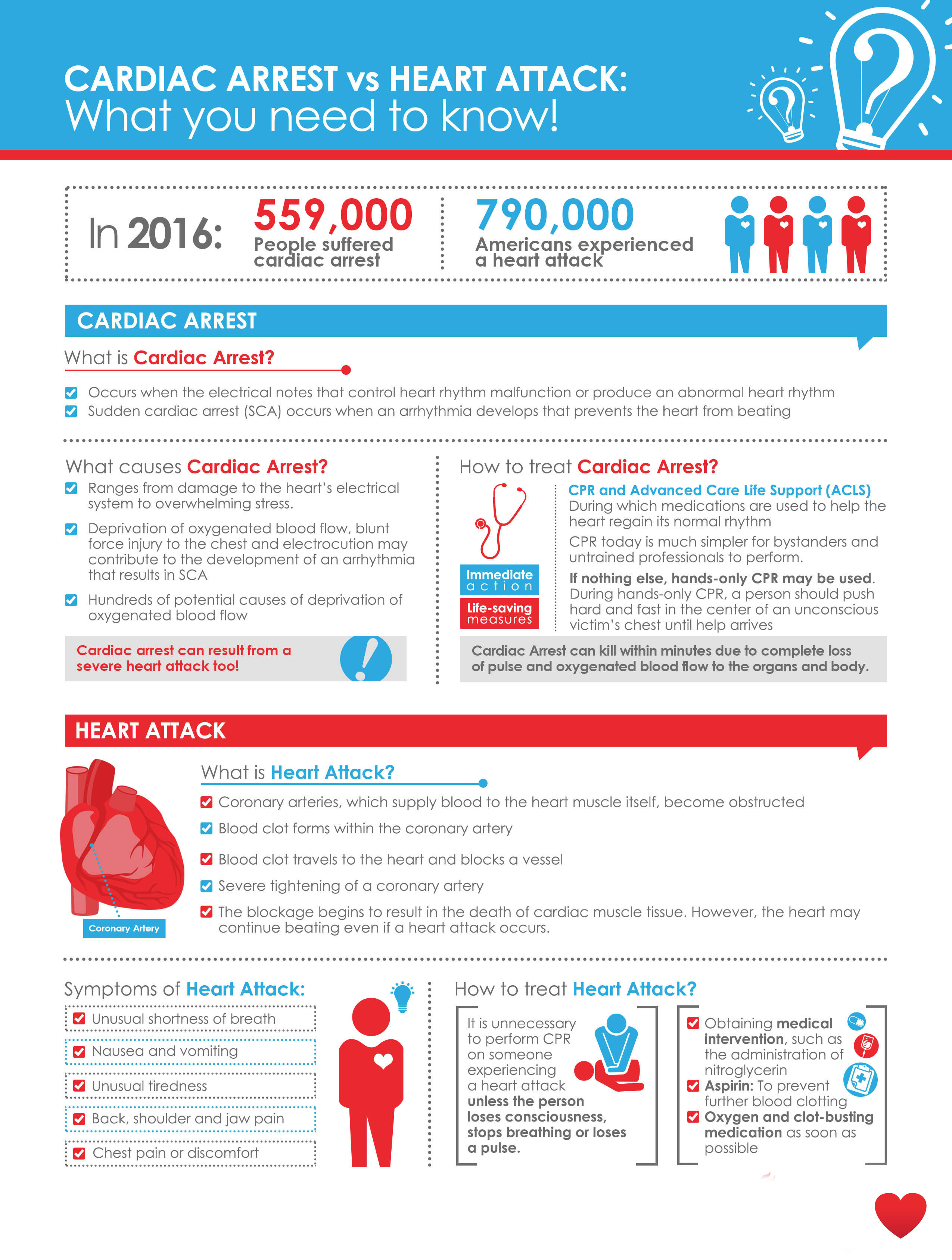 MORE THAN 559,000 PEOPLE SUFFERED CARDIAC ARREST IN BOTH OUT-OF-HOSPITAL AND IN-HOSPITAL SETTINGS IN 2016. Meanwhile, 790,000 Americans experienced a heart attack, or myocardial infarction, during the same year, explains the American College of Cardiology (ACC). Although similar, cardiac arrest is not an interchangeable term for a heart attack. Unfortunately, cardiac arrest and heart attack assumptions often lead to skewed survival rates, understanding of intervention methods and treatment of such conditions.
