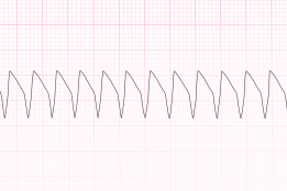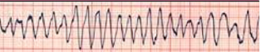 Pulseless ventricular tachycardia (VT) and Ventricular fibrillation (VF) are life-threatening cardiac rhythms that result in ineffective ventricular contractions. The ventricular motion of VF is not synchronized with atrial contractions. VT or VTach (Figure 24) is a condition in which the ventricles contract more than 100 times per minute. VF or VFib (Figure 23) is a rapid quivering of the ventricular walls that prevents them from pumping. The emergency condition, pulseless VT, occurs when ventricular contraction is so rapid that there is no time for the heart to refill, resulting in undetectable pulse. In both cases, individuals are not receiving adequate blood flow to the tissues. Despite being different pathological phenomena and having different ECG rhythms, the ACLS management of pulseless VT and VF are essentially the same. Pulseless VT and resuscitation for VF starts with the BLS Survey.