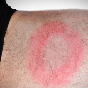 Figure 12bLyme disease can produce a distinctive “bull’s eye” rash (Figure 12b). Seek medical treatment.