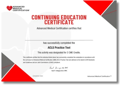 Now, you can earn 2 CME credits for completing the ACLS Practice Test. This accredited CME opportunity allows medical professionals to demonstrate their expertise, fulfill continuing education requirements, and strengthen their confidence in ACLS decision-making.