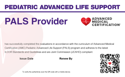 Our Pediatric Advanced Life Support (PALS) courses are eligible for AMA Category 1 Credits™. The Postgraduate Institute for Medicine (PIM), an accredited provider, has reviewed AMC’s Pediatric Advanced Life Support (PALS) Certification Course, and the PALS Certification training course has been approved for AMA Category 1 Credits™.