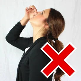 After ensuring that the scene is safe and protective equipment is on, press both sides of the nostrils just below the bony portion of the nose for a minimum of 5 to 10 minutes. If bleeding continues, try holding pressure for an additional 10 minutes. Sit upright and lean your body and your head slightly forward. This will keep the blood from running down your throat, which can cause vomiting. (Do NOT lay flat or put your head between your legs.) If bleeding continues after this, seek further medical care. If the victim has trouble breathing or shows signs of severe distress, call 911/EMS.